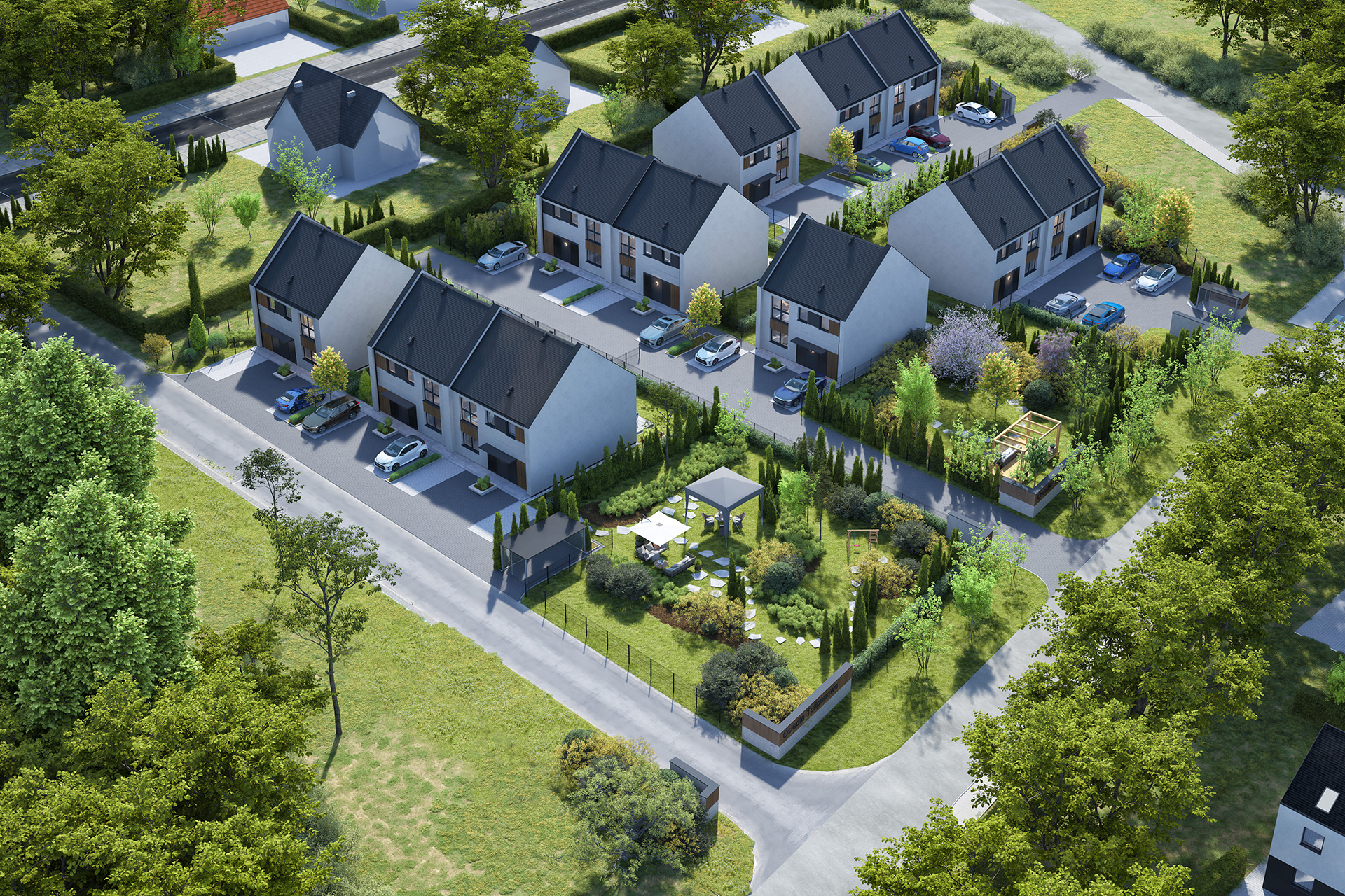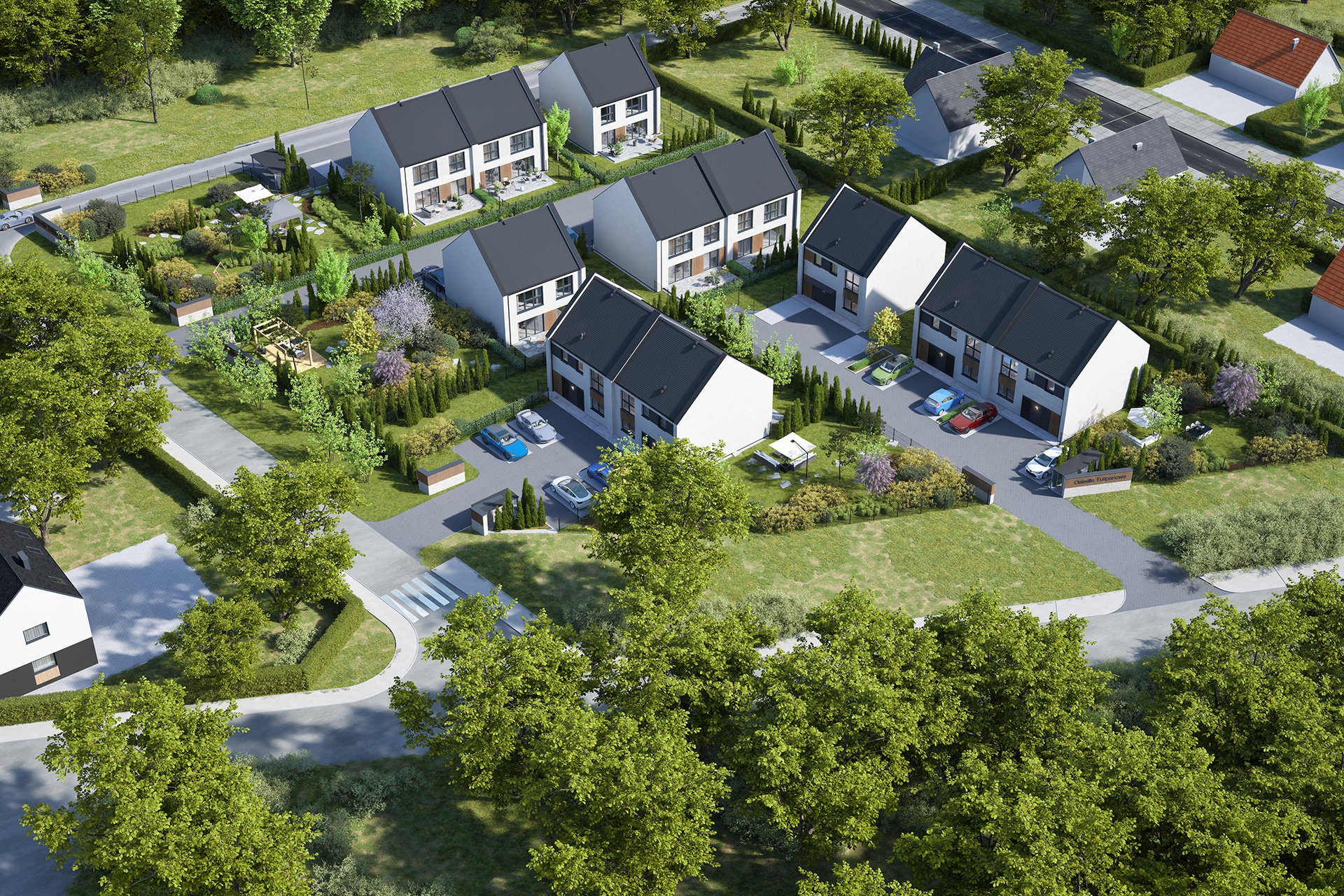 Zespół zabudowy mieszkaniowej obejmujący pięć domów jednorodzinnych w zabudowie bliźniaczej oraz jeden dom wolnostojący.